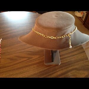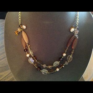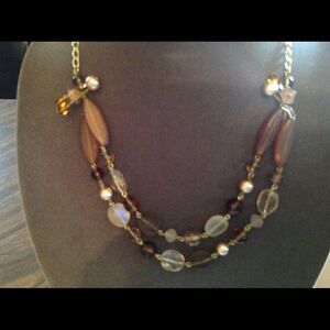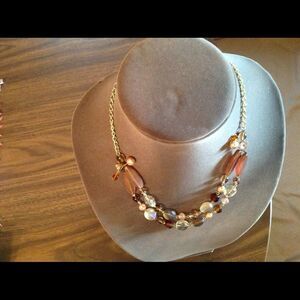 NWOT QVC glass bead necklace in pretty fall colors of brown, cooper, white. Adjustable length with gold chain.