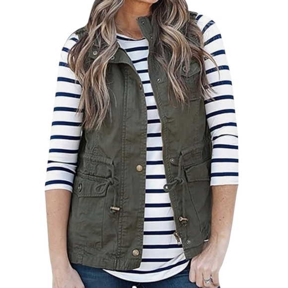Qearal Zip-Up Drawstring Anorak Jacket Military Vest Outerwear w/ Pockets
