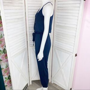 Qeesmei V-neck Jersey Knit Jumpsuit Blue Small Sleeveless Overalls Jogger