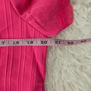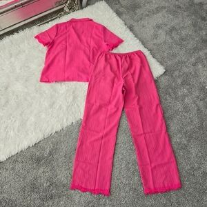 Qeils Casual Two Piece Set for Women - Button Down Short Sleeve Shirt and Pants. Lace Detail. Ribbed Textured. Hot Pink. Size Medium. New in package.