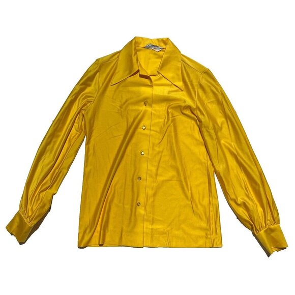 This Qiana Lady Arrow shirt is a bright and classic vintage piece, featuring a cheerful yellow color with a collared neckline and long sleeves. The button-up front adds a touch of timeless elegance, while the size large fit ensures comfort and versatility. Perfect for adding a pop of color to your wardrobe, this shirt embodies a blend of vintage charm and everyday wearability.