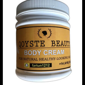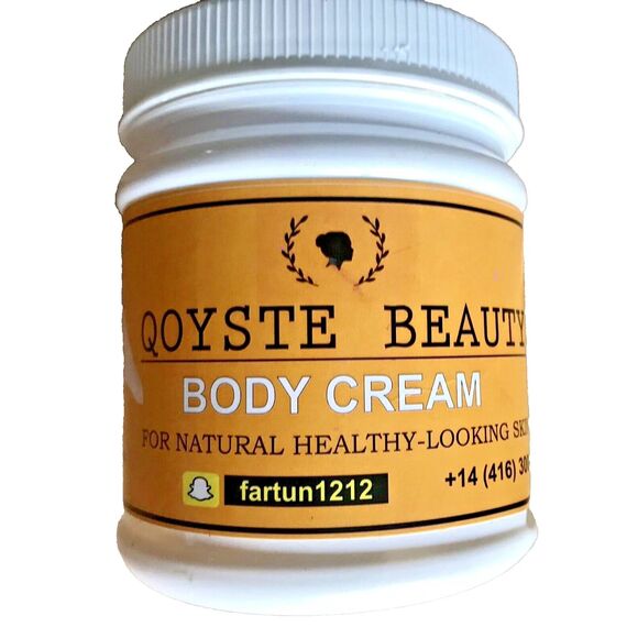 QB Qoyste Body Cream For natural healthy – looking skin Natural ingredients - vitamins E & C, Cocoa butter, coconut oil, Lemon, proteins, milk, eggs. With Fartun 1212. For external use only. Jar is 4 inches tall and 3 inches in diameter