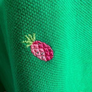 Add a pop of color and personality to your wardrobe with this Quacker Factory Green Pineapple Polo Shirt. The collared neckline with a button closure and short casual sleeves make it a perfect fit for any casual occasion. The contrasting trim and embroidered accents on the 100% cotton knit fabric add a touch of style to the solid green pattern.