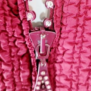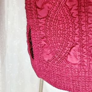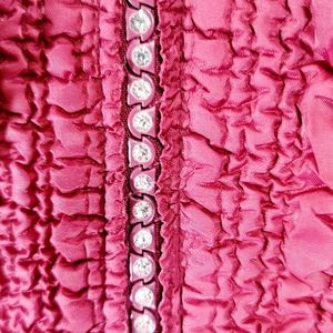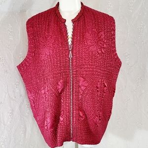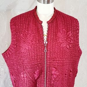 Beautiful vest. Feels like silk. Comfortable and warm. The color is NOT red. It's actually more like magenta.