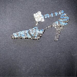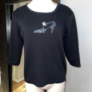 Fun and sparkly black top from Quacker Factory featuring 3/4 sleeves, a rhinestone shoe design on the front, and extra rhinestone accents around the neckline. Size L.