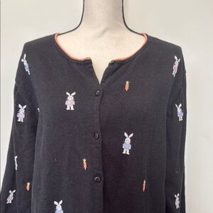 Charming black cardigan with playful bunny embroidery. Features button-down front and orange trim. Perfect for adding a whimsical touch to your wardrobe. Length from top of shoulder to bottom hem 27 inches