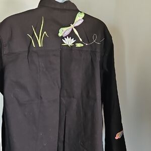 Black jacket with colorful embroidered dragonflies and water lilies. Front zipper closure. Lightweight, decorative stitching throughout. Bright multicolor accents add charm. Comes from smoke-free home. size1x