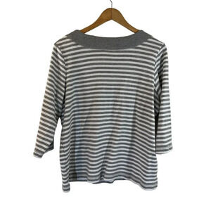 Elevate your wardrobe with this stunning gray and white striped Quacker Factory blouse in size XL. The boat neck and 3/4 sleeves give it a classic silhouette that's perfect for any occasion, whether it's a party, casual outing or workwear.