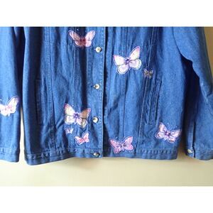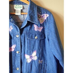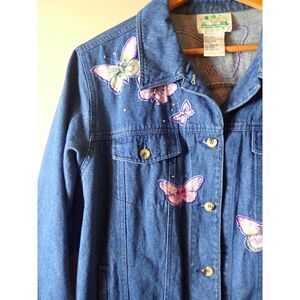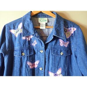 Quacker Factory Denim Jacket Embroidered Beaded Butterflies Medium Blue 90s