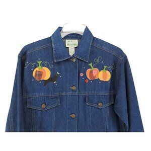 Quacker Factory Denim Jacket for women in size medium features autumn embroidery on a solid blue trucker style. This high-quality denim piece combines comfort and seasonal charm. (hg)