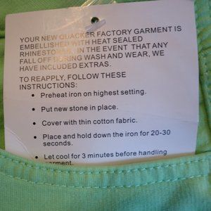 Quacker Factory Dream Jeannes features fly front closure with five pockets. 96% cotton and 4% spandex. Generous fit. Hand wash recommended but I always machine wash and hang dry these items. Measurements as follows: Waist 30 inches, Hip 40 inches, inseam 23 inches. NWT