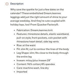 Upgrade your wardrobe with these Quacker Factory DreamJeannes leggings that are perfect for any occasion. Whether you're traveling, going to a party, or just wearing them for casual or business events, these leggings will make you feel comfortable and stylish. The leggings feature rhinestone accents and a solid pattern, with a dark fabric wash that gives them a classic and sophisticated look.