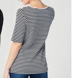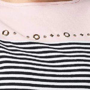 Features: striped, short sleeves, color-blocked above bust with embellishment at the yoke