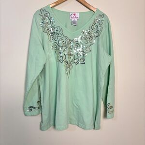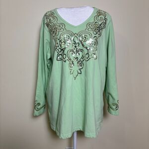 Quacker Factory Embellished V-Neck Shirt Womens 1X Pale Green Sequin Paisley