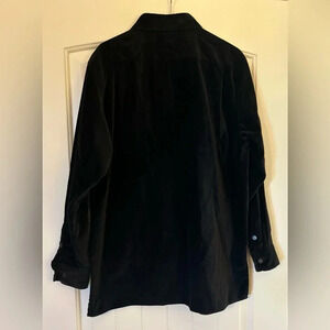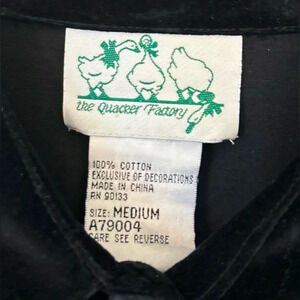 Vintage Quaker Factory Black Velvet/ Embroidery/Rhinestone Shirt. Button Up. Long Sleeve. Solid back. Size medium. Excellent/Like New Condition. Very clean and from a pet/smoke free home. Measurements and fabric content in pictures.