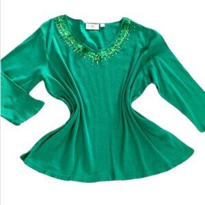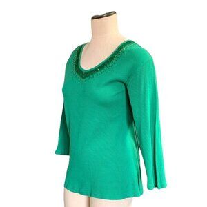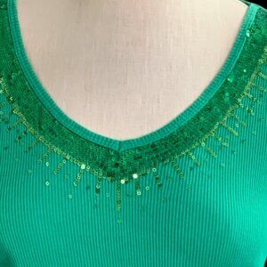 Quacker Factory Green Sequin Rib Knit V-Neck Top Side Slits Sz L #19407