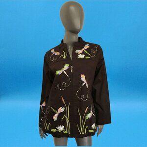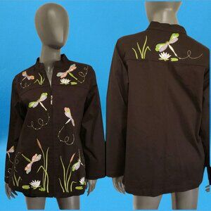 Quacker Factory Jacket Dragonfly Embroidered Black Coat Stretch Denium Medium