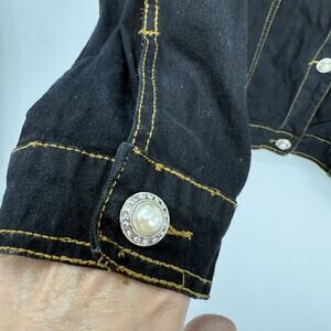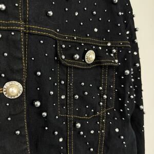 pearl missing on cuff button,, a few pearls missing on collar,,Quacker Factory Jean Jacket size Large Dark Silver Pearl Embellished Dark Blue Denim