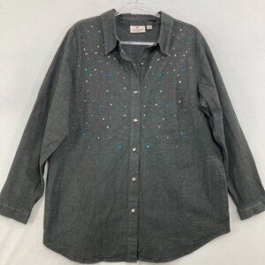 Quacker Factory Large Gray Embellished Long Sleeve Relaxed Button Down Festival