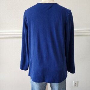 Preowned Quacker Factory vibrant royal blue crew neck t-shirt featuring a festive winter scene print on the chest, perfect for holiday or winter wear. good condition.