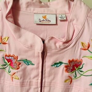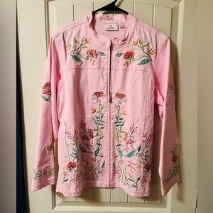 Quacker Factory pink women's jacket featuring intricate floral and butterfly embroidery and pockets. New without tags. Size Large. Perfect for adding a touch of style to any outfit.