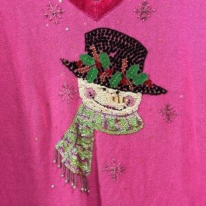 Quacker Factory Pink V Neck Sequin Beaded Snowman Cotton Blend Sweater