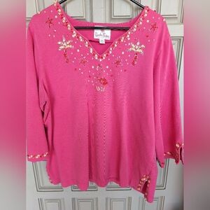 Quacker Factory Pullover Pink Sequins V Neck SzXL 3/4Sleeves 100% Cotton Quality