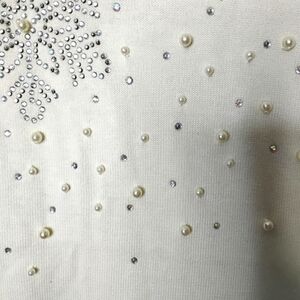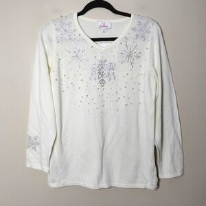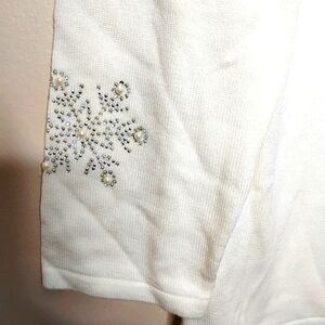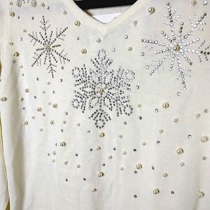 New with tags Quacker Factory festive sweater in winter-white cream. V-neck, long sleeves, and scattered rhinestone & faux-pearl snowflakes—pretty shimmer in person. Cozy medium weight; perfect for holiday parties or après-ski vibes.