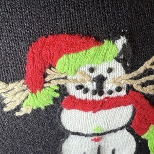 Style keywords: Ugly Christmas sweater, holiday, snowman, scarf, embroidery, embroidered, cat, snowman, festive, party, winter