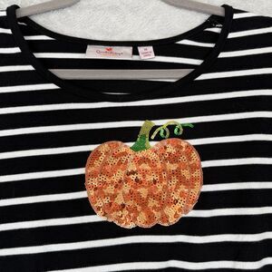 Quacker Factory Sequin Pumpkin Top Womens 1X Black Stripe Halloween Fall Autumn