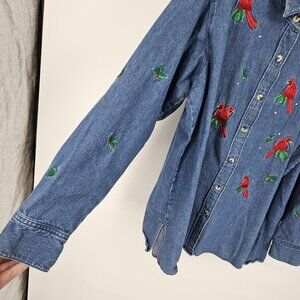 Quacker Factory Shirt Womens 1X Blue Denim Embroidered Cardinal Birds Holiday