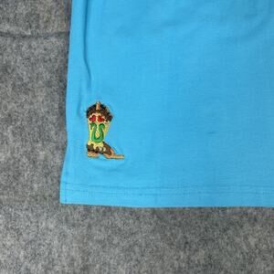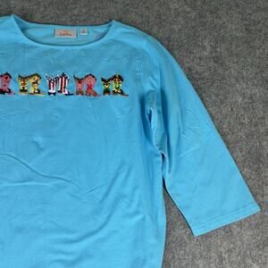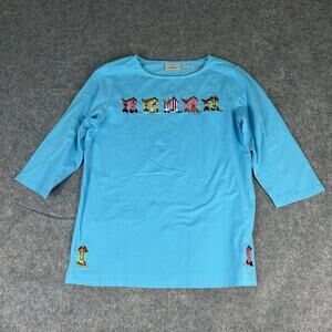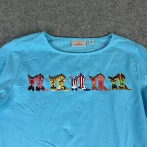 The Quacker Factory women's medium shirt features embroidered cowgirl boots, making it a stylish and whimsical addition to any wardrobe. This patriotic-themed top is perfect for casual occasions, parties, or even travel, with its solid blue color and 3/4 sleeves adding a touch of fun and flair. Easy to care for with machine washable fabric, this pullover shirt is a versatile choice for the summer, fall, and spring seasons. Perfect for those who appreciate a touch of Western charm in their outfit.