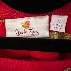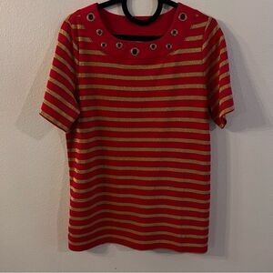 Quacker Factory Shirt Women’s. Red And Metallic Gold Stripes. Round Neck. Grommets Around The Neck With Rhinestones. Short Sleeves. Size M. 70% cotton 20% polyester 10% metallic fibers. Length from shoulder to bottom is 28”. Armpit to armpit is 21.5”.