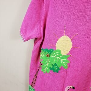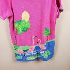 Pre-owned condition with staining on the front. Please see photos. Size large. Short sleeve knit sweater. Crew neck. Brightly colored beach scene with flamingos.