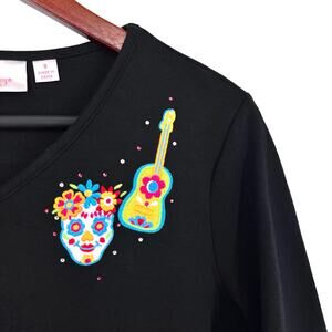 Quacker Factory Small Black Fiesta Dia De Los Muertos Day of The Dead Shirt Top