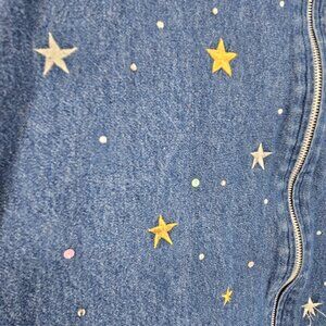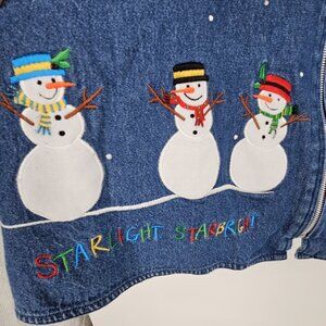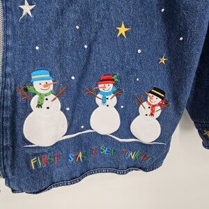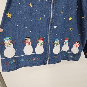 Snowman Denim Jacket Womens 1X Blue Zip Up Christmas Stars Embroidered Sequin Holiday