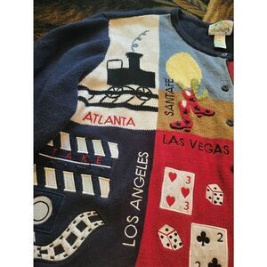 Quacker Factory Sweater Women's 2X Blue Embroidered Patriotic American Cities