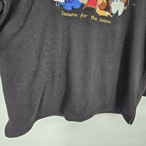 Features embroidered and beaded nativity scene on front with "Reason for the Season" text. Back features star, shepherds, and sheep design. Beaded/sequined accents throughout.