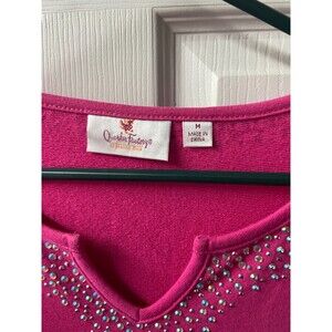 This Quacker Factory top is a women's medium pink shirt with embellishments in the form of beads and sequins. It features a V-neckline, 3/4 sleeves, and a pullover closure. The fabric is knit and stretchy, making it suitable for travel, parties, or casual wear. The top is machine washable and made from a blend of polyester and cotton, ensuring easy care and durability. With a solid pink color and basic style, this top is perfect for various seasons and occasions while adding a colorful and classic touch to your wardrobe.