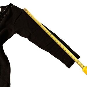 Quacker Factory- Unisex black background cotton ramie blend pullover longsleeve Ugly Christmas Sweater with V-neckline. Featuring a shimmering green sequin decorated tree design with beaded garland and ornaments in shades of blue, red, lavender, sparkling gold and silver. scattered snowflakes and a gold star topper. Plain on back. Velvet banding and bead trim on the side slit hem, sleeves and neck. (Made for a woman but would work on a guy, just scrunch up sleeves if they are too short).