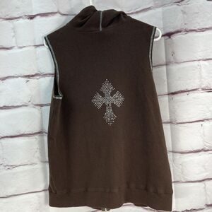 women’s sleeveless hoodie vest, zip-up hooded vest, brown, chocolate, mocha, silver trim, rhinestone embellishments, studded accents, cross design, waffle knit texture, cotton blend, soft stretch fabric, casual fit, relaxed style, comfortable layering piece, casual wear, fall winter fashion, boho chic, western-inspired, sparkly, stylish, unique