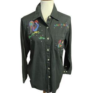 Quacker Factory Vintage 90’s Black Long Sleeve Button Down Shirt Embroidered Roo