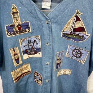 Quacker Factory Vintage Denim Lighthouse Shirt Womens L Embroidered Ocean 1781