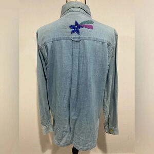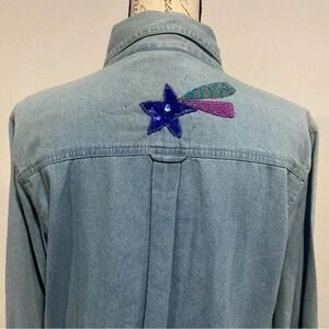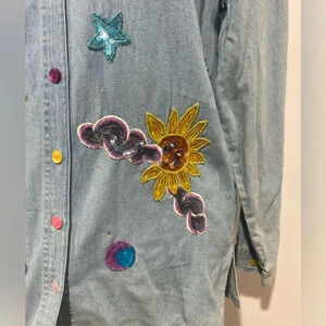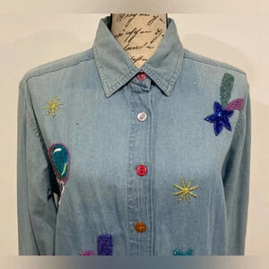 Quacker Factory Vintage Womens Blue Beaded Sequin Denim Button Up Shirt Medium