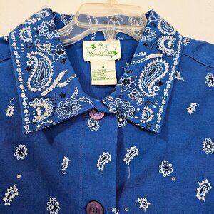 This Western Styled Jacket with Bandana Paisley Patterned Beaded Rhinestones in Royal Blue Twill Size 1X will add a touch of glam to your spring, fall and festive seasonal wardrobe. Size 1X. Its eye catching details in the buttons, collar, cuffs and bordered bottom gives a different fashionable look to this casually glamorous jacket. Preowned. No Flaws. Very Good Condition.