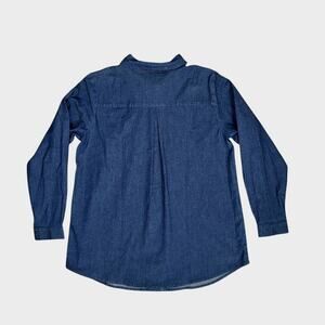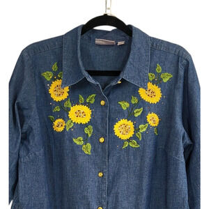 Quacker Factory Women M Denim Tunic Button Up Shirt Sunflower Rhinestone Cottage