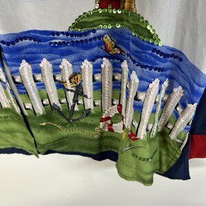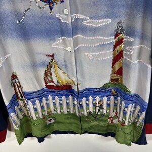 Quacker Factory Womens 100% Silk Button Up Top Size Large Nautical Sequin Art