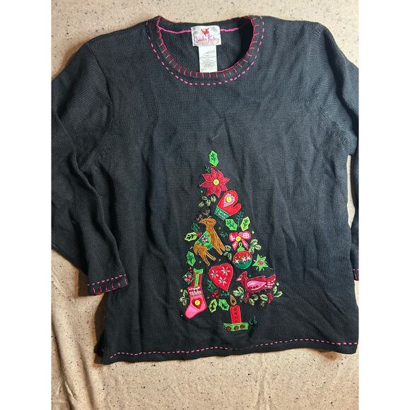Quacker Factory Women’s 1X Christmas Sweater Black Embroidered Tree Holiday Knit