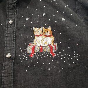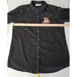 Quacker Factory Womens Black Embroidered Cat Button Up Shirt Size L Holiday