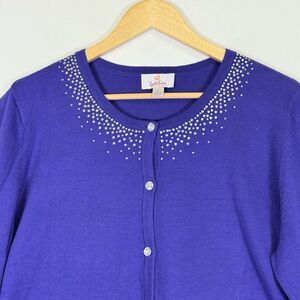 Quacker Factory Womens Large Royal Purple Cardigan Sweater. Whimsical rhinestones around the neckline and bottom, button front.